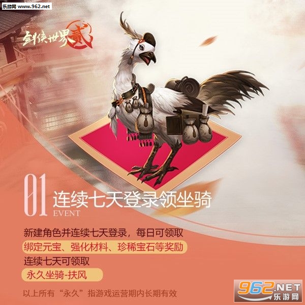 新建角色并连续七天登录,每日可领取绑定元宝、强化材料、珍稀宝石等奖励,第七天可领取永久坐骑-扶风。