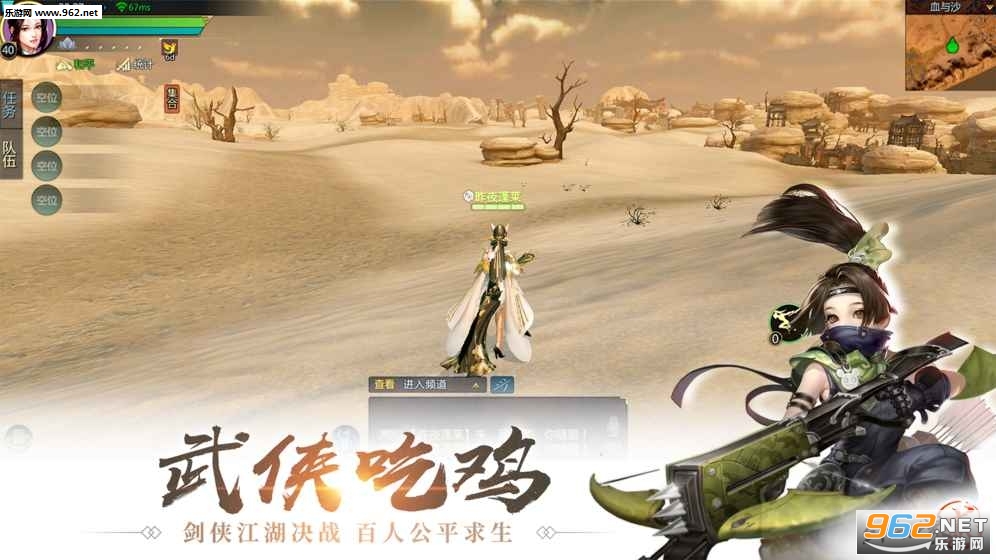 全新公平生存玩法“血与沙”开创武侠吃鸡新潮流!公平无属性差别,开局一只雕,装备全靠捡,100人沙漠生存竞技,毒圈之内,是苟?是刚?最终对决胜者吃鸡!